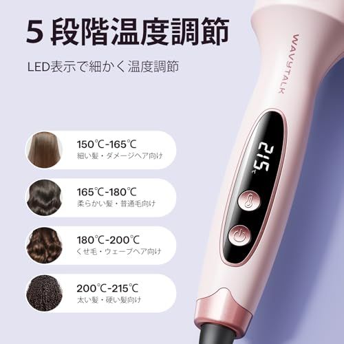 【5段階温度設定&LEDディスプレイ】髪質に合わせて150215まで、150/165は細く傷みやすい髪に、180は普通髪に、200/215は太く硬い髪に最適なブラシアイロン。デジタル表示付きで温度が一目で確認でき、熱ダメージを抑えながら理想のスタイルを実現します