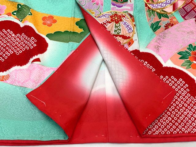 七五三 7歳 女の子用 着物セット 正絹 女の子 絞り染 金駒刺繍 絵羽柄の子供着物 コーデセット 浅葱色 熨斗に鞠 IYS 1017 i 15 18 MM