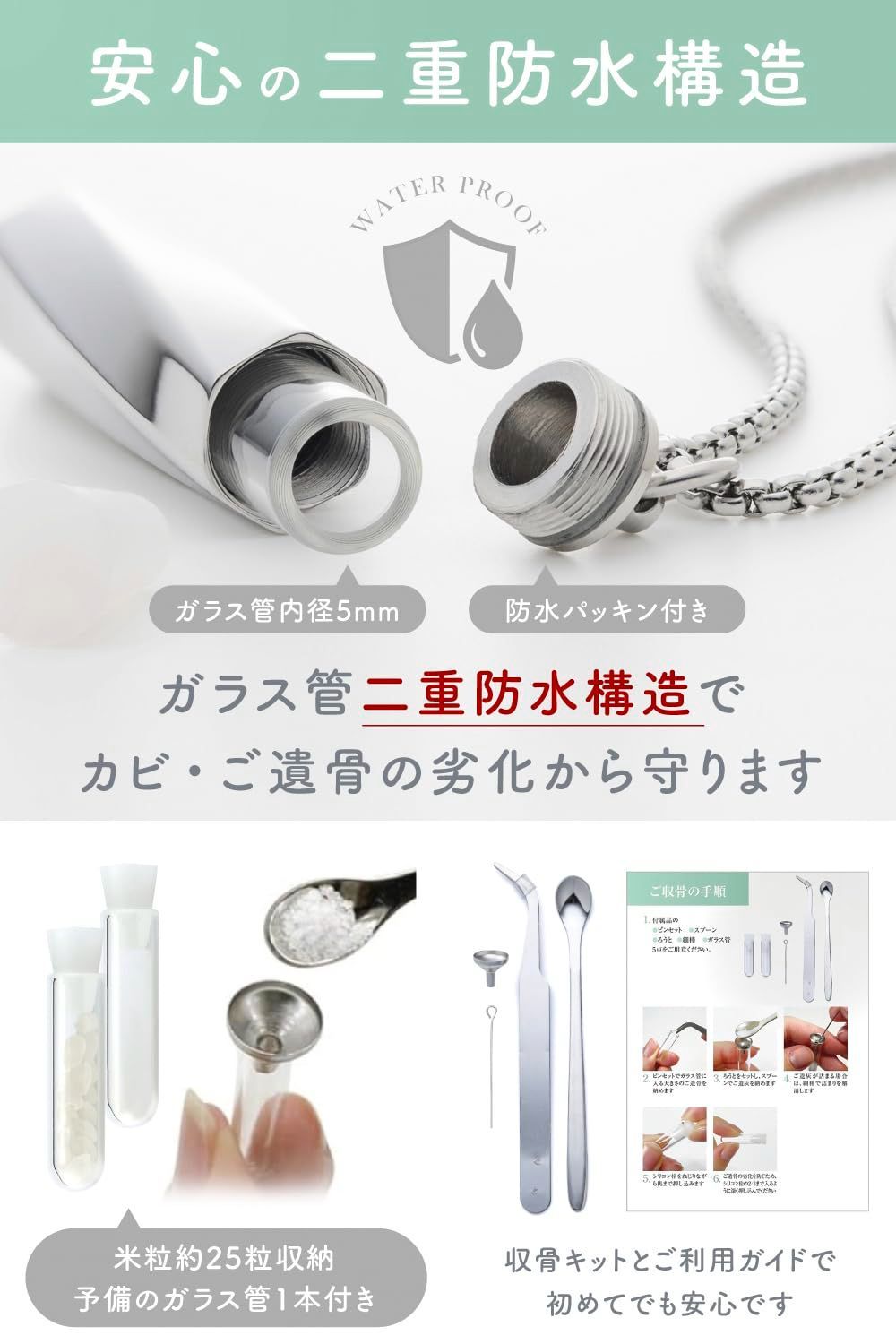 【ガラス管入り二重防水構造】 ペンダント内側にガラス管入りの「二重防水構造」。フタの裏側には「防水パッキン」が付いており、 ご遺骨の劣化(カビ・腐敗・悪臭)から末長く守ることができます。
