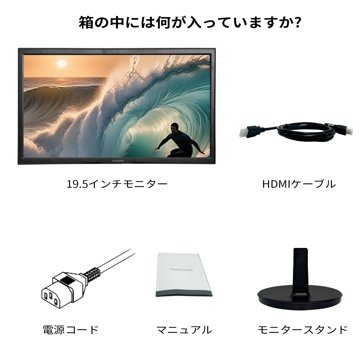 19.5インチPCモニター:1. 画面保護フィルム付きモニター。2. モニター内蔵スピーカーを使用する前に、必ずHDMIケーブルでモニターのHDMIポートに接続し、音声出力がモニター内蔵スピーカーに設定されていることを確認してください。
