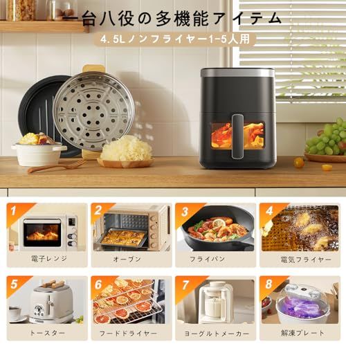Wallfire ノンフライヤー 4 5 L大容量 電気フライヤー ノンオイル 揚げ物 惣菜 1 5人 エアーフライヤー LEDディスプレイ タッチパネル タイマー 温度調整 日本語説明書 日本語レシピ付き PSE認証済 黒色 49 e 037 f