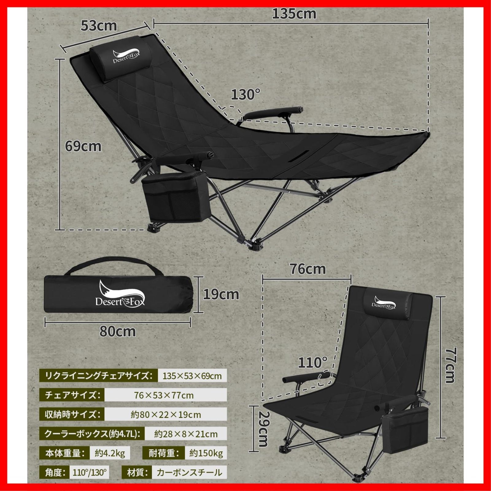 ?【追加功能】:枕+サイドポケット+肘掛け+弾性メッシュバッグ◆【枕】DesertFox:ヘッドレストは可動式です。ヘッドレストは取り外しが可能で、腰当てとしても利用可能です。特にリクライニングチェアとして使用する際は、腰部をより良く保護し、より快適になります。【抜群なサイドポケット】タオル、スマホなどの収納に活用できます。◆【肘掛け付き】左右に2つのアームレストがあり、両手と肩に十分なサポートを提供し、よりリラックスできます。◆【弾性メッシュバッグ付き】:背もたれの後ろに大きな弾性メッシュバッグが付いており、本、メガネケース、タオルなどの持ち物をスッキリ収納できます!