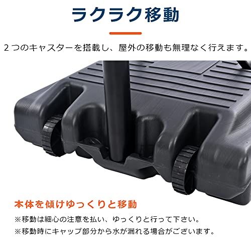 【移動スムーズキャスター付】2つのキャスターを搭載し、屋外の移動も無理なく行えます。本体を傾けゆっくりと移動移動は細心の注意を払い、ゆっくりと行って下さい。※移動時にキャップ部分から水が漏れる場合がございます