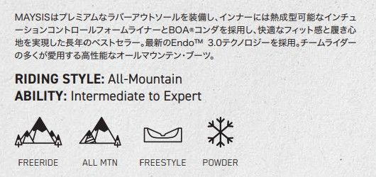 MAYSISはプレミアムなラバーアウトソールを装備し、インナーには熱成型可能なインチューションコントロールフォームライナーとBOAコンダを採用し、快適なフィット感と履き心地を実現した長年のベストセラー。