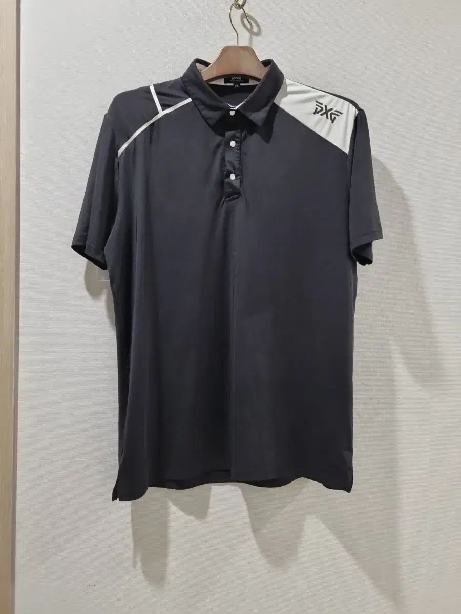 PXG ブラック/ホワイト バイカラー 半袖 カラーTシャツです。ショルダー部分に白色でPXG ロゴがPOINTで入っています。