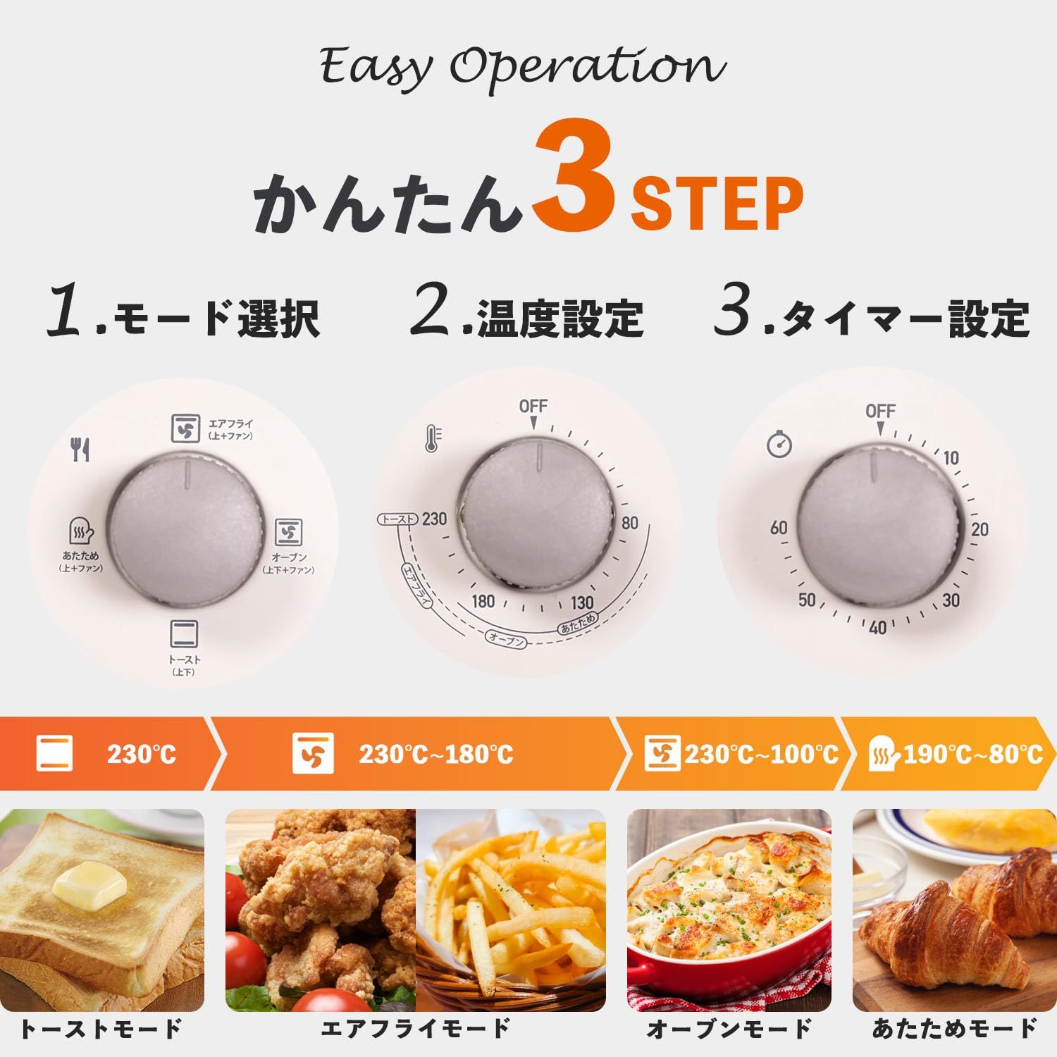 【簡単シンプル操作】操作は「モードダイヤル」「温度調節ダイヤル」「タイマーダイヤル」の3つで完結します。ファンや上下ヒーターの使用有無がわかるアイコンが記載された「モードダイヤル」、選択モードに合った温度の設定範囲が記載された「温度調節ダイヤル」により、簡単に調理に合わせた設定が行えます。