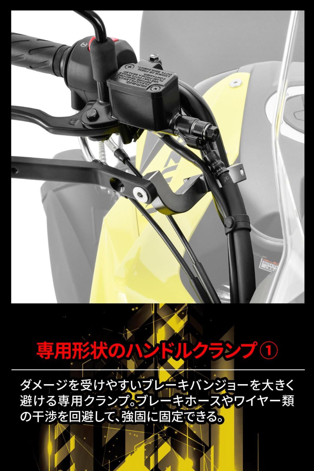 Vストローム250SX用に専用設計されたアルミニウムハンドガード。 オフロード走行にも耐えうる高強度アルミニウム合金を採用。 ハンドルクランプを専用形状とすることにより、ワイヤー類の干渉を回避。 純正ハンドルバーに簡単に装着できるボルトオン設計。