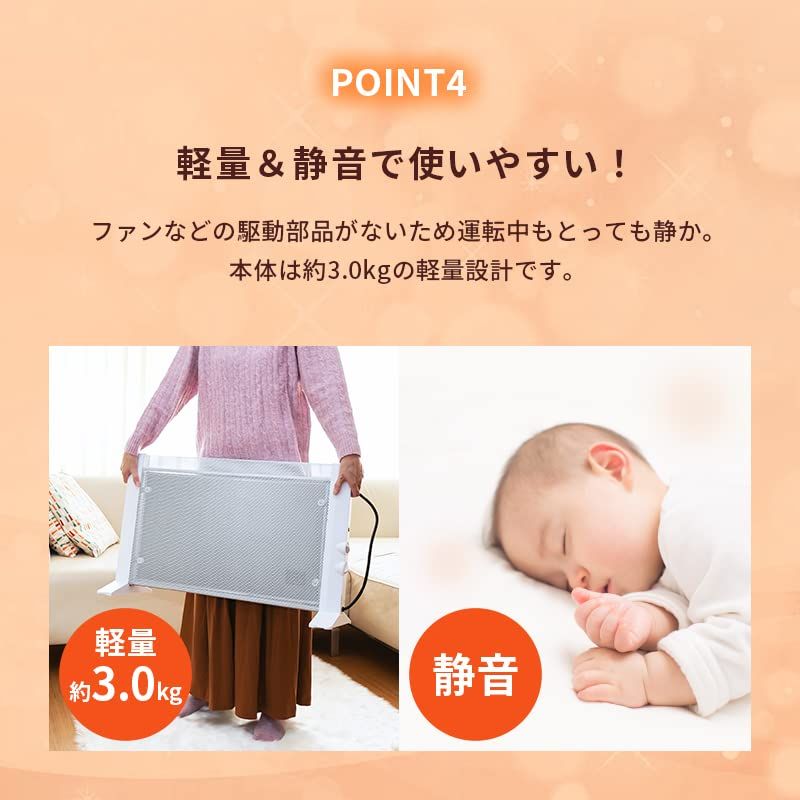 【ご注意】本品は両面放熱ヒーターです。片面のみの放熱はできません。家庭用コンセント容量15A以上を単独で使用してください。水に濡れる可能性のある場所(浴室、水栓のそば、屋外など)では使用しないでください。