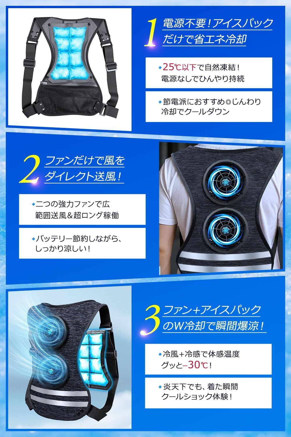 最大 30℃瞬間冷却 2025夏業界独創 冷却ベスト 暴風ファン アイスパック 冷却服 空調作業服 ファン付きベスト バッテリーファンセット ベスト 20000 mAh大容量バッテリー 50時間以上連続使用 Monoyoi 空調扇風服