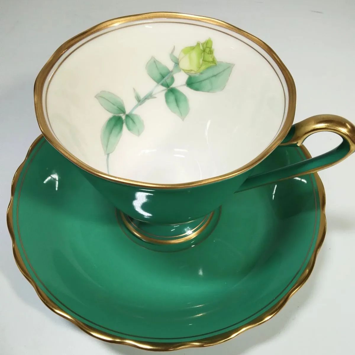 グリーンカップの内側に色違いのバラ模様です。専用箱に入れたままで未使用の長期保管品です。