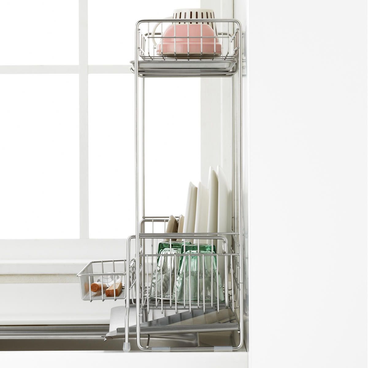 ●シンクサイドのわずかな隙間を利用して使える伸縮式の水切りラックです。