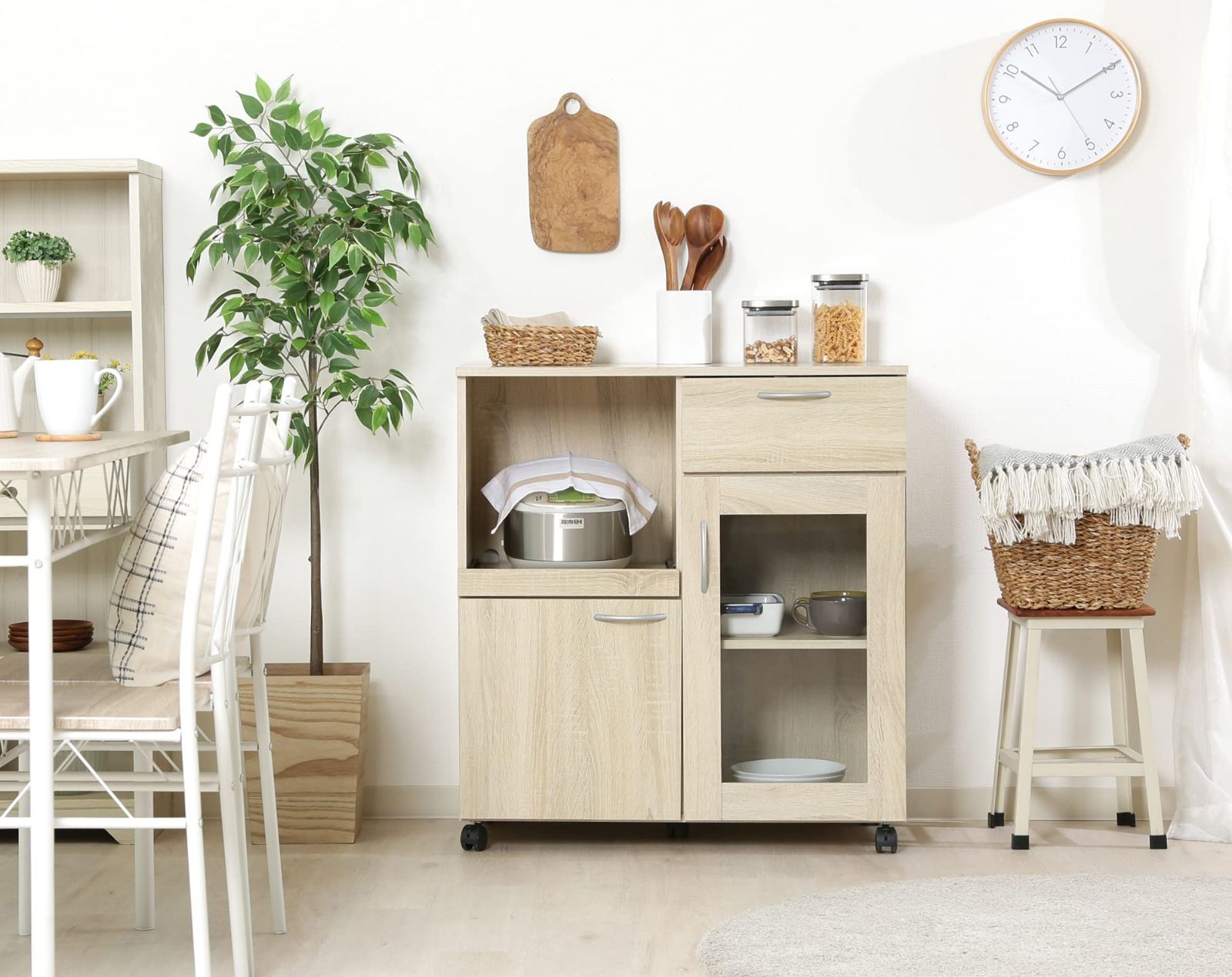 他のインテリアに馴染みやすいナチュラルなホワイトオーク色のキッチンワゴン炊飯器やケトルなどの調理家電などの収納にぴったりのスライド棚つき