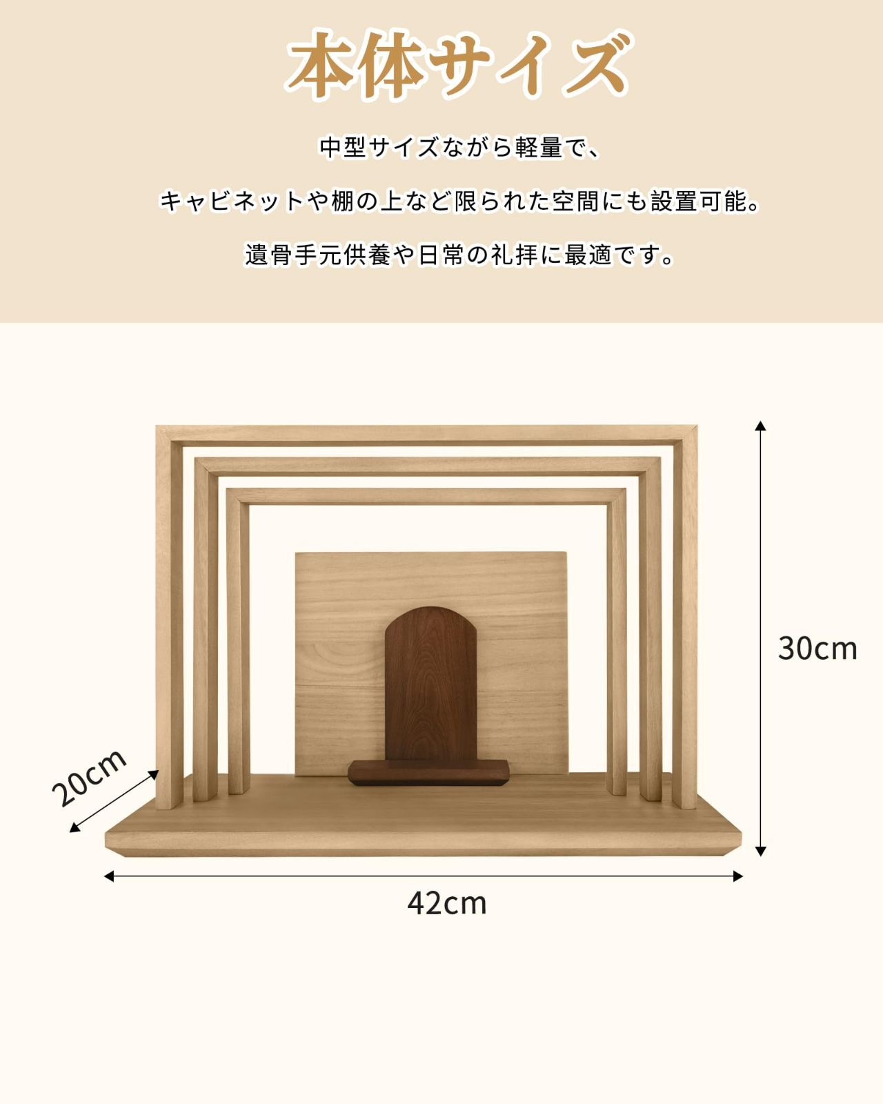 【組み立て簡単な仏壇】本体サイズ:42cmX20cmX30cm、お位牌4.5寸以内に対応、操作しやすいにマグネットが埋め込まれて固定し便利です。簡単に置くだけで組み立て完了、ほっこりと優しい気持ちになれます。置き場所の幅を取らないオープン型、ちょっととしたスペースで設置もできます。