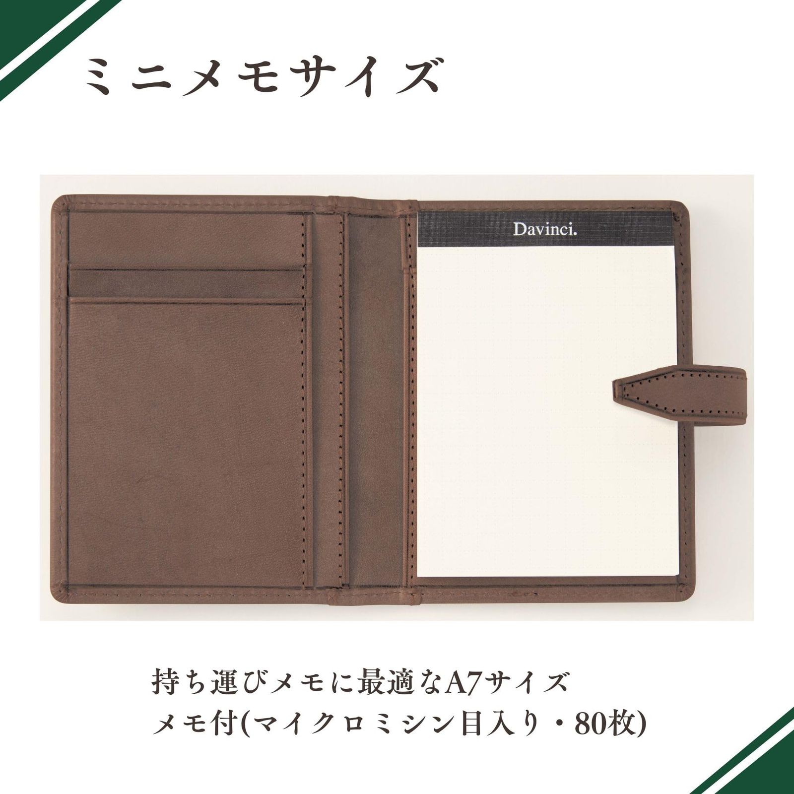 Davinciロロマクラシック手帳の意匠を取り入れたメモカバー。メモと一緒にカード等も一緒に持ち歩ける