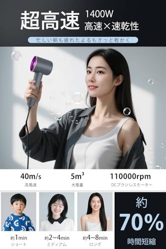 2025トップモデル 超軽量 大風量 ドライヤー 速乾 3億マイナスイオン 美髪ケア 1400 W 高速 スマート温調 4段階温度 3段階風量 過熱防止 携帯用ドライヤー コンパクト 磁吸ノズル付き ヘアドライヤー サロン級 美容師監修 家 f 6 af ed 5