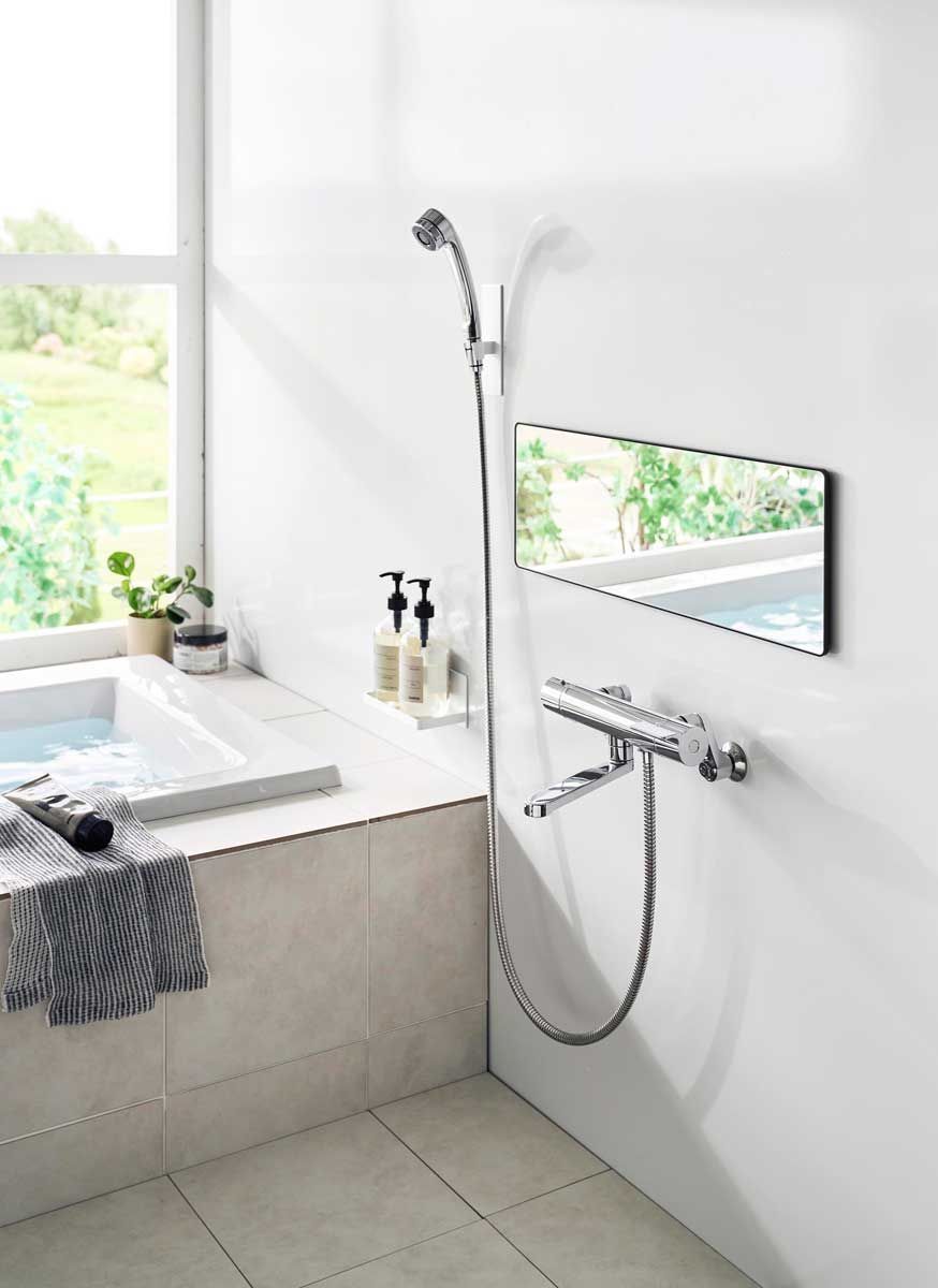 美しく、透明感があるロングサイズの角型ガラス製バスルームミラーです。フレームと壁の隙間に指を入れて取り外しやすい形状なので、お掃除がしやすく清潔に保てます。曇り止めフィルムを全面に粘着加工しているため、鏡面が曇らず快適にお使いいただけます。