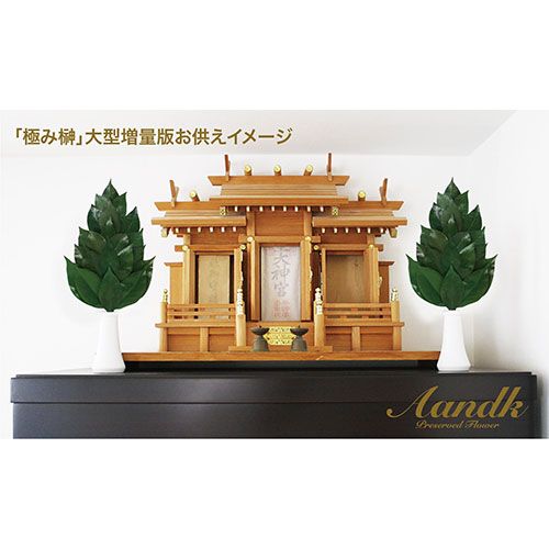 プリザーブド加工された丹波産の高級椿葉の中から、ツヤのある綺麗な葉のみを厳選使用。実用新案の技術を用いて、葉っぱ一枚一枚にワイヤーを通し、神棚に飾る榊として美しい形になるように成形。外国産にありがちな、枯れる、葉が丸まる、しおれるということがほとんどなく、適した環境に保管できれば3年以上美しい状態を保てます。水やりが不要なので、水が腐るニオイもなく清潔。特に高い場所にある神棚の場合、水換えは手間のかかる作業ですがそれも必要ありません。造花(シルクフラワー)とは異なり、本物の生木を保存加工したものだから、神様にためらうことなくお供えできます。
