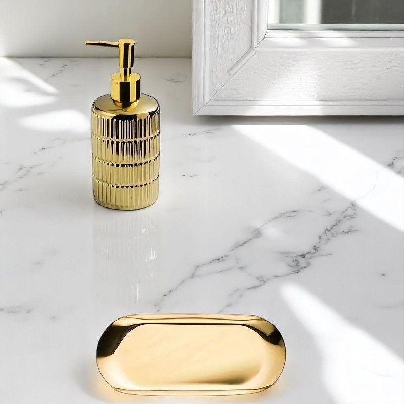 このソープディスペンサー&トレイは、セラミック製のゴールドデザインで、洗練された美しさを持つバスルーム及びキッチン用品です。スタイリッシュな外観は、洗面台や台所のインテリアを一層引き立ててくれます。ボディイソープや石鹸をさりげなくディスプレイできるだけでなく、トレイとして小物を整理整頓するのにも大変便利です。