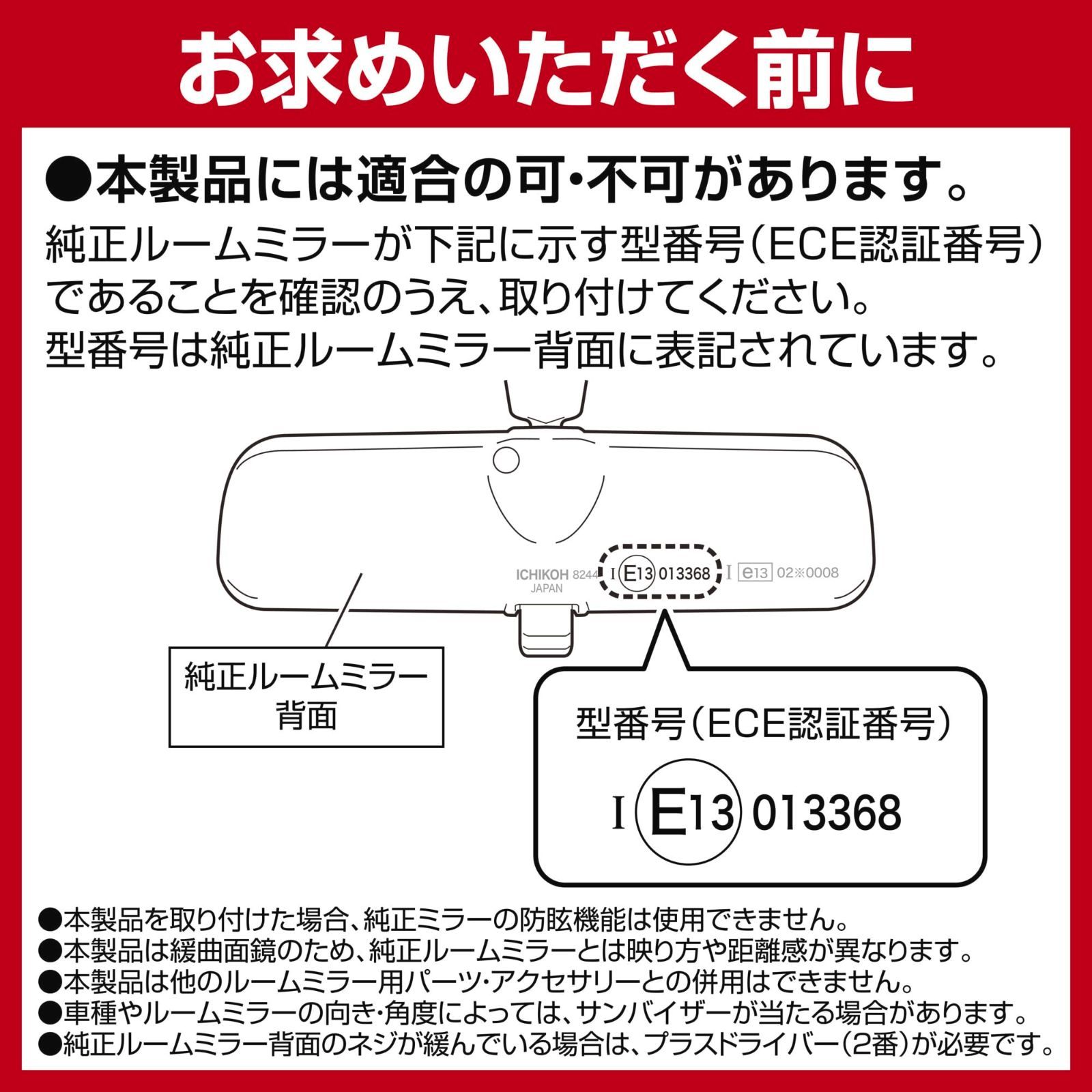 ・本製品には適合の可・不可があります。純正ルームミラーが下記の型番号(ECE認証番号)であることを確認のうえ、取り付けてください。型番号は純正ルームミラー背面に記載されています。