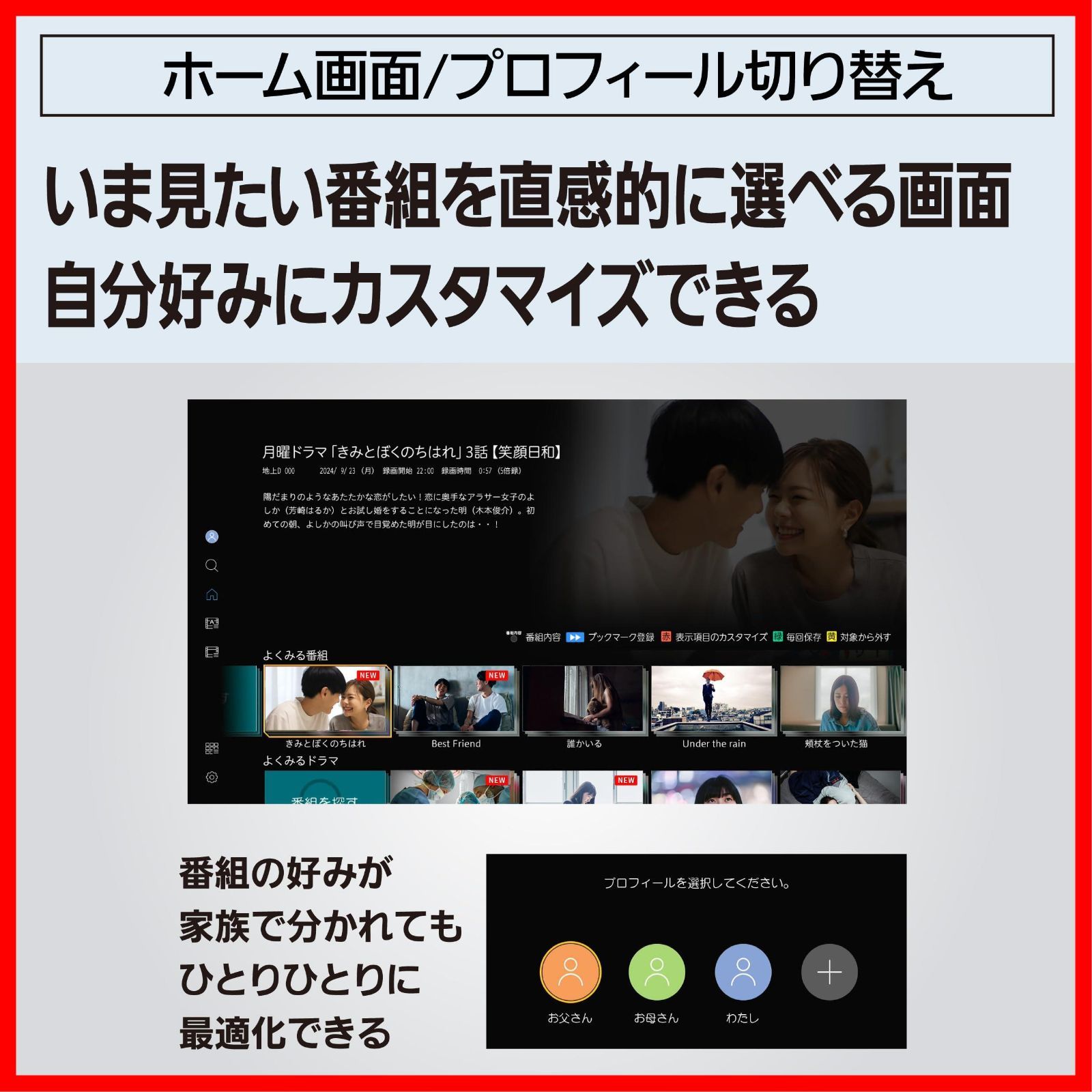 操作性でネット動画のように番組が探せるホーム画面