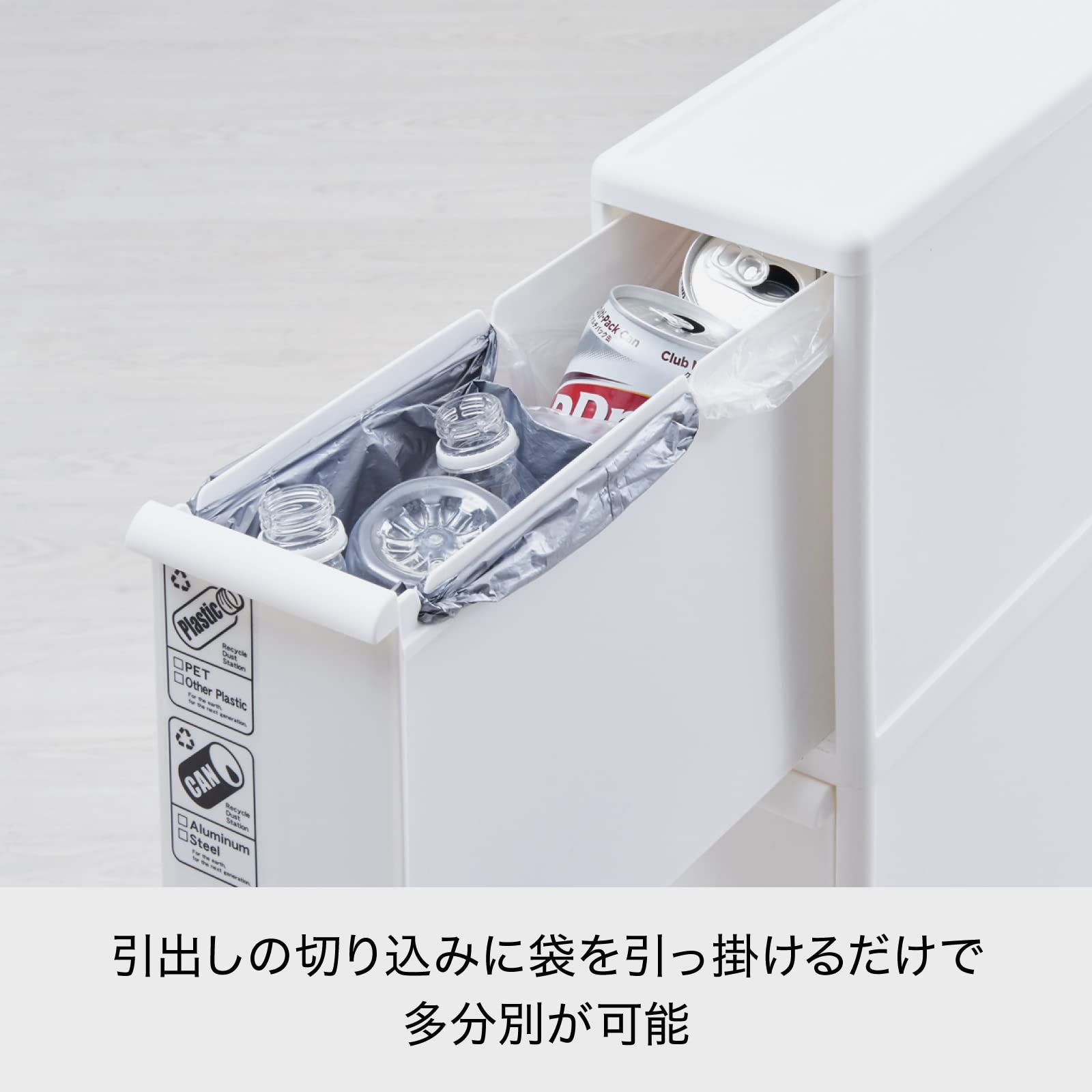 引出し内部のフックに袋を引っ掛けて、分別可能