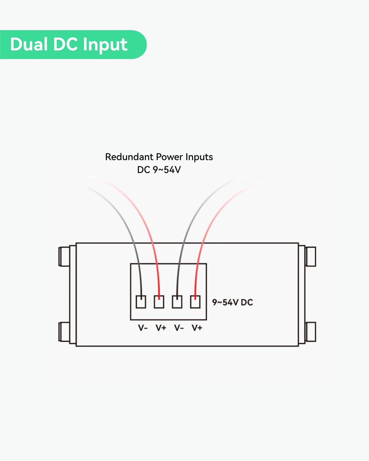 【デュアル電源入力を備えたノンストップPOE供給】:2チャンネルDC9V-54V冗長電源入力と自動フェイルオーバーをサポートし、高信頼性ネットワークシステムをします。