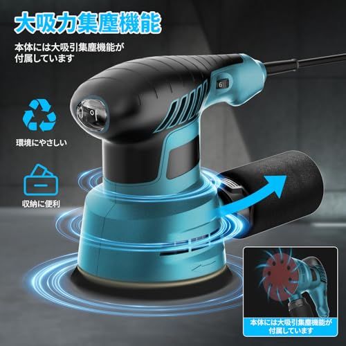 【ランダムオービットサンダー?6研磨スピードギア調整】このランダムサンダー円軌道に沿って回転する働作軌道があって、均一に研磨跡を分布することができて、滑らかできれいな表面を形成します。一般的な電動サンダーと比較して、より広い運働軌道と振働を減少し、より正確で均一な研磨を実現すると同時に、あなたの手の疲労を軽減することができます。また、このサンダーは6つの不要な速度調整ギアを搭載しており、最小6000から最大12000までの速度調整が可能です。低速設定では繊細な仕上げが可能で、高速設定では効率的な粗加工が可能です。研磨、研磨材料、用途に応じて回転速度を調節することができます。また、研磨粒度の異なる紙やすりを組み合わせることで粗加工から仕上げまで幅広い作業シーンで使用できます。