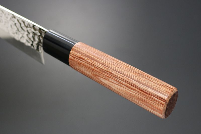和包丁風のハンドルスタイル。ハンドル材は美しい木目調の赤合板材を使用。鋭い切れ味とメンテナンスの良さを兼ね備えた包丁。鎚目磨きは風合いが美しいだけでなく、食材がブレード面にくっつきにくいこともあり、切れ味を助長し切離れよく快適にカットできます。