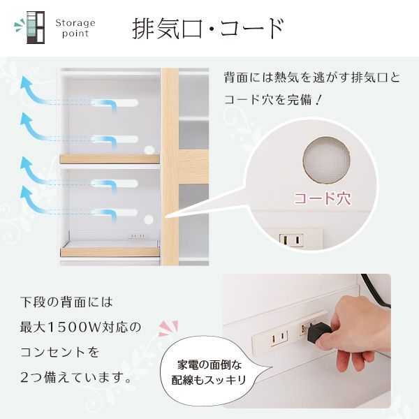 収納スペースを左右に分け、左側に家電収納棚やフルオープンの引出し