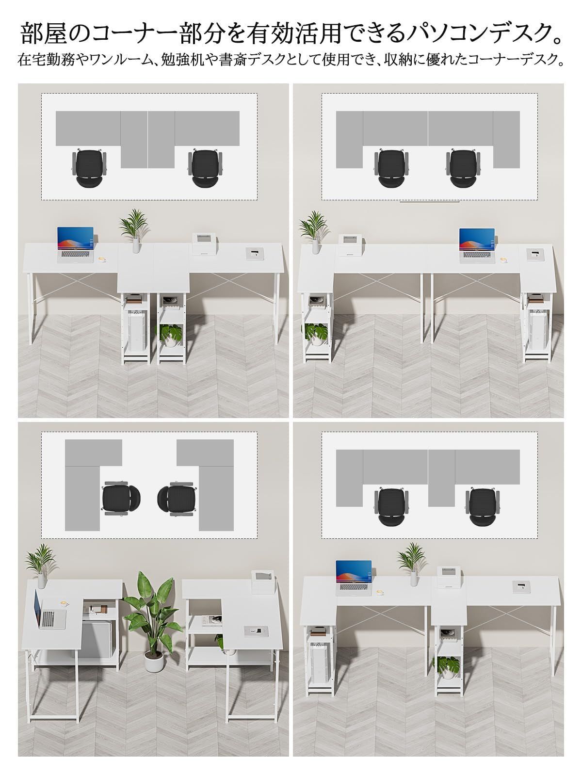 収納棚は左右どちらにも付け替え可能:L字デスクは、収納棚を左右どちらにも取付が可能です。お部屋のレイアウトや利き手に合わせて置きたい場所に置けます。パソコンデスクはコーナーにもお部屋の中心にもフィットします。空間を活かせるデザインでベストな作業環境が整います。書斎机、子供の学習机、作業机としても適当です。