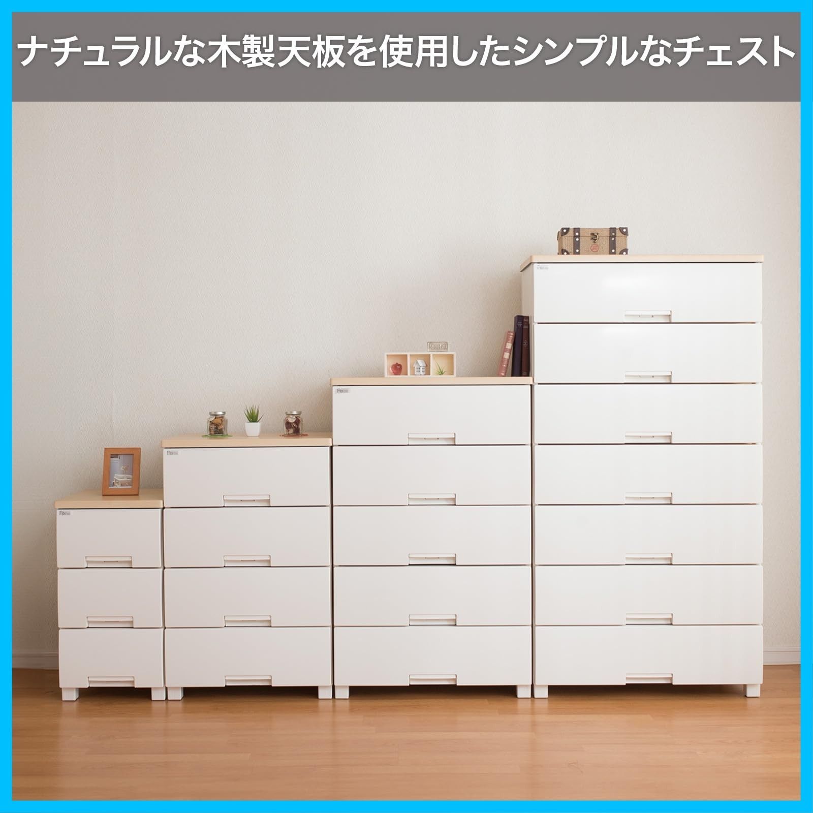 ナチュラルな木製天板を使用したシンプルなルームチェストです。特許取得済みのロック機能やスムーズな引出しローラーなど、嬉しい機能が満載です。