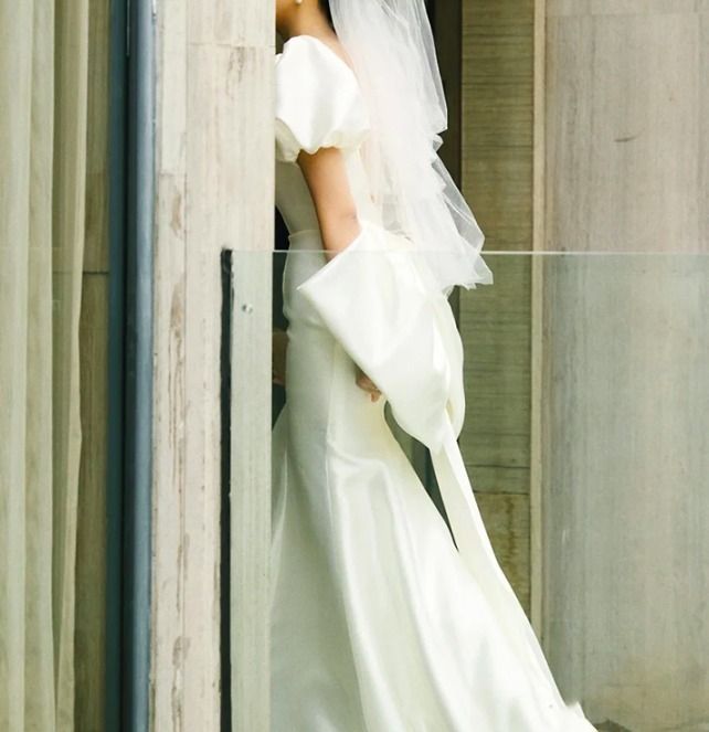 ロング マーメイド ウェディングドレス パフ袖 フリル サテン