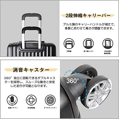 【双輪キャスター&多段調節可能キャリバー】 静音、耐久性に優れた双輪キャスターは、自由に360度回転し、旋回時や悪路の走行も安定しています。故障率の高いシングルタイヤに比べて、安定感抜群です。軽量かつ頑丈なアルミ製のキャリバーは、ボタンワンプッシュで身長や利用シーンに合わせて多段階調整ができます。男女問わず、ビジネスでの出張でもカジュアルなご旅行でもシーンを選ばずに使用できるデザインです。