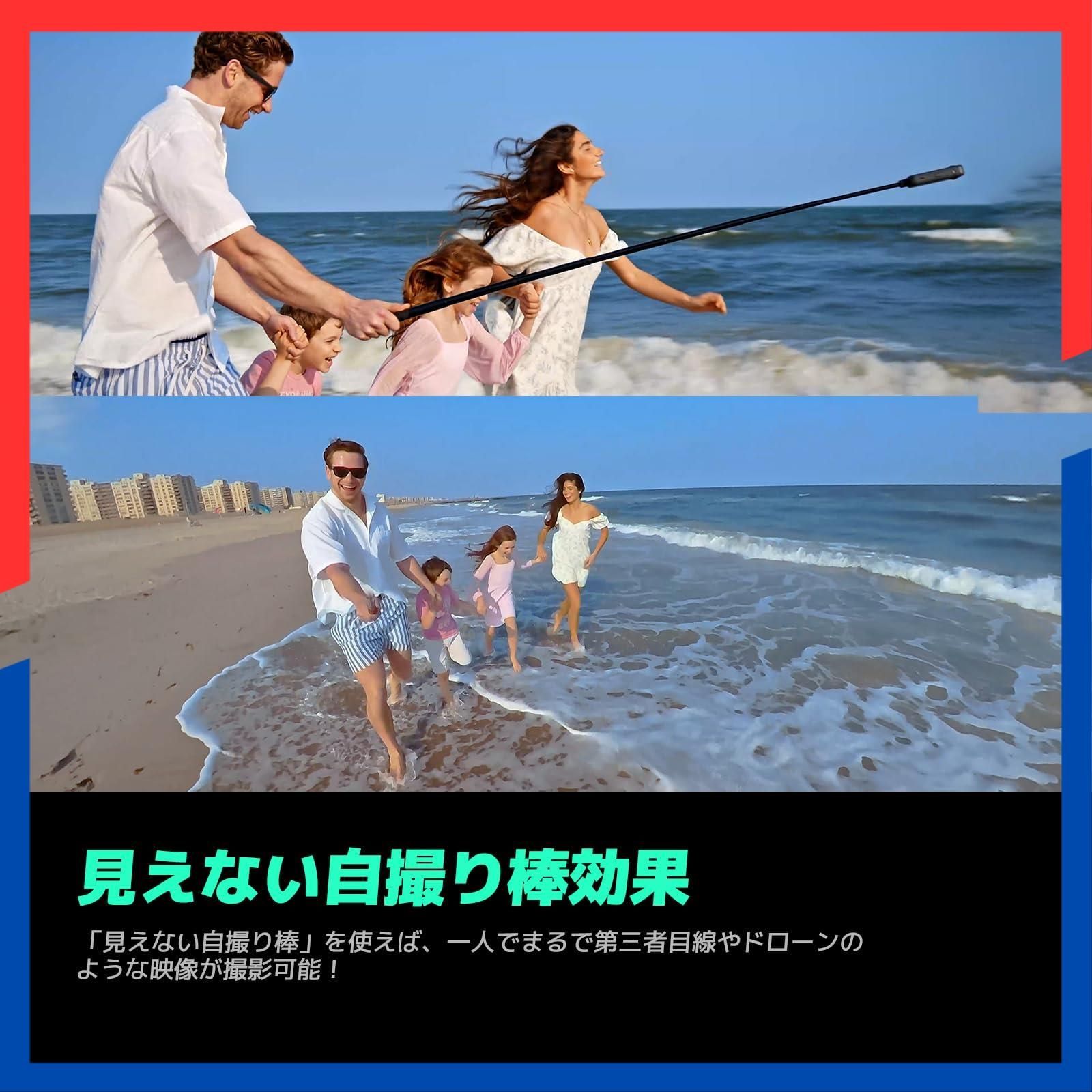 【超安定映像・見えない自撮り棒効果】SuperSmooth安定化技術と360度水平維持で、どんなに回転しても映像は常に水平を保つから、激しい動きも心配無用。新次元の手ブレ補正を実現!また、従来のアクションカメラとは異なり、このカメラは「見えない自撮り棒」を使えば、一人でまるで第三者目線やドローンのような映像が撮影可能!カメラマンがいなくったって大丈夫!※見えない自撮り棒は付属です。