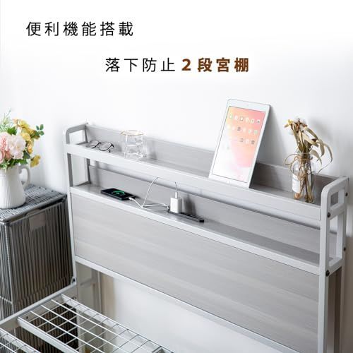 アイアンベッド カビ防止 スチールベッド 脚付き 収納付きベッド フレームのみ 高耐荷重 シングルベッド パイプベッド 2段宮棚付き 頑丈 ベッドフレーム 木製 USB 2口コンセント アッシュグレー グレー SINNONAKA