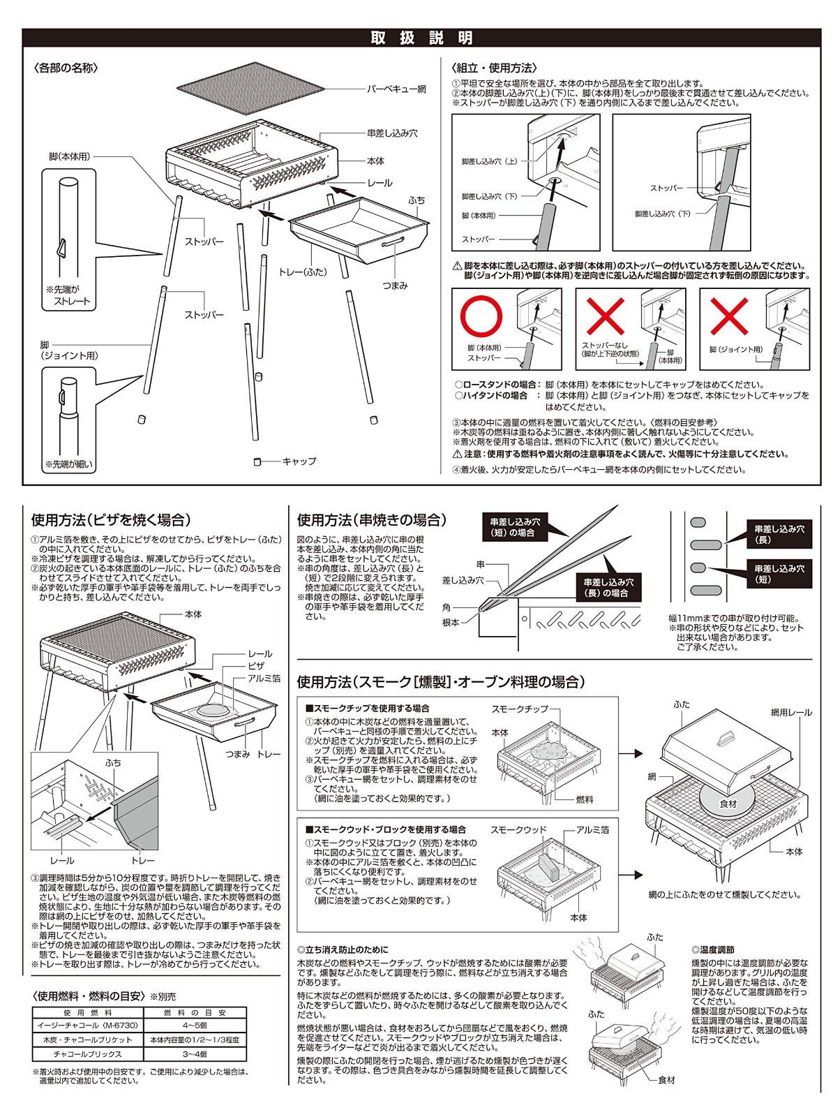 セット内容:本体×1、トレー(ふた)×1、バーベキュー網×1、脚(2本つなぎ)×4、キャップ×4、収納バッグ×1