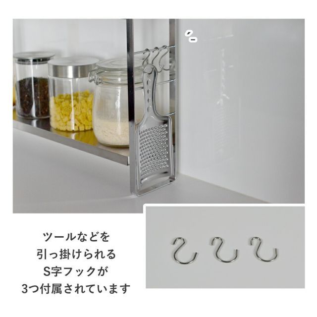・便利なS字フック3つ付属。S字フック付きなので、おろし金や計量スプーンなどよく使うツールを引っ掛けて置けます。