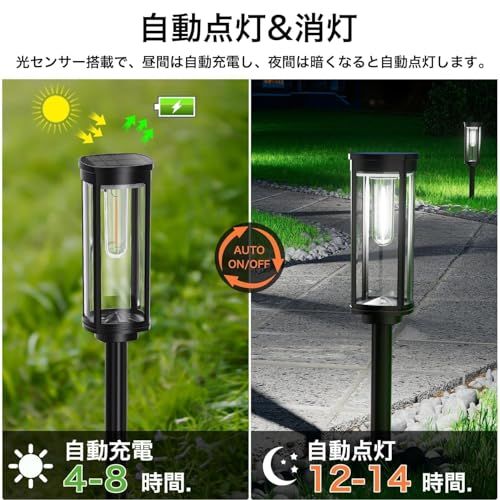 【高効率単結晶ソーラーパネル】 本ソーラーライトはアップグレードされた単結晶シリコンソーラパネルを採用します。理想的な日照条件下での変換効率は最大約30%。このガーデンライトは1.85Wh大容量バッテリー内蔵で、晴天なら約48時間で満充電。満充電時は約812時間点灯します。実際の時間は季節、天候、設置角度により変動します。パネルは太陽光に向け、遮られないように設置してください。