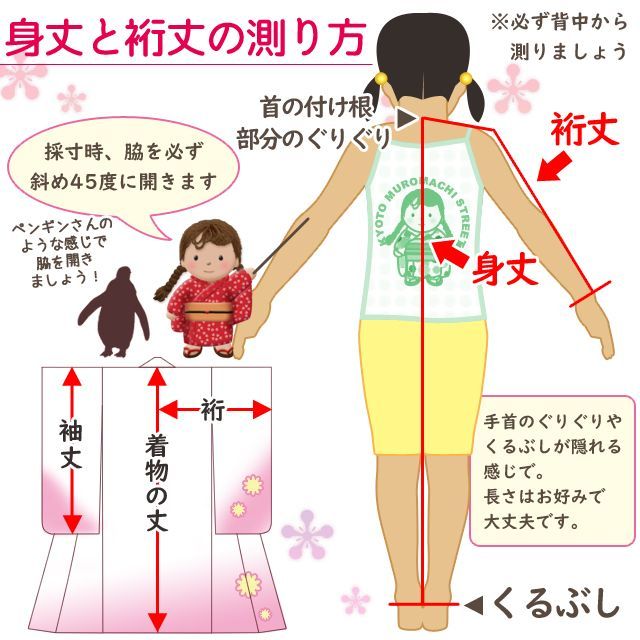 また、着物はご注文後にお子様の寸法に合わせて身上げ・肩上げ加工をさせていただく「プチオーダーメイド」となっており、少し小さなお子様や、数え年で七五三をされる方にもおすすめです。