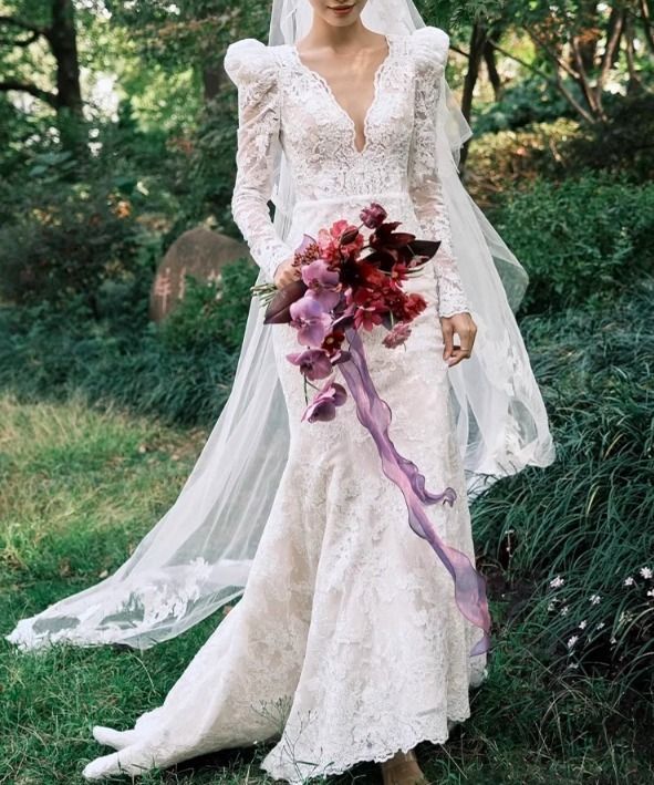 フィッシュテール ウェディングドレス 総レース Vネック 上品