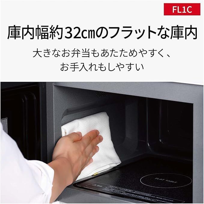 広々フラット庫内&大きめボタン。お弁当などの大きな食品もあたためやすく、さっと拭けてお手入れしやすい。大きなボタンで、操作も簡単。