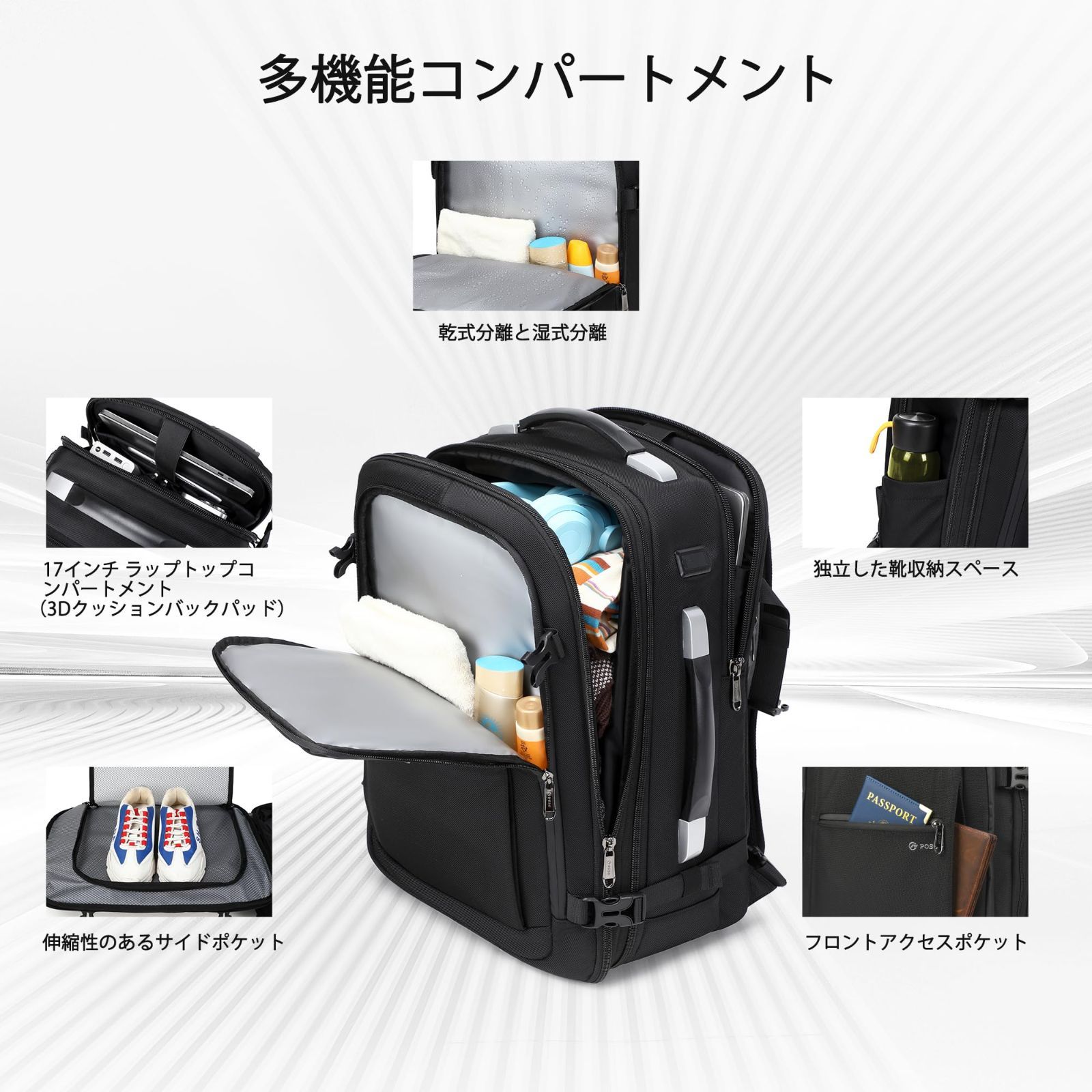 効率的な収納ソリューション:通常のバックパックの5倍のアイテムを収納できます。3つのメインコンパートメントと複数の隠しポケットで持ち物を整理整頓できます。濡れた衣類と乾いた衣類を分けて収納できる専用ポケットに加え、17インチまでのノートパソコンを安全に収納できるコンパートメントも備えています。