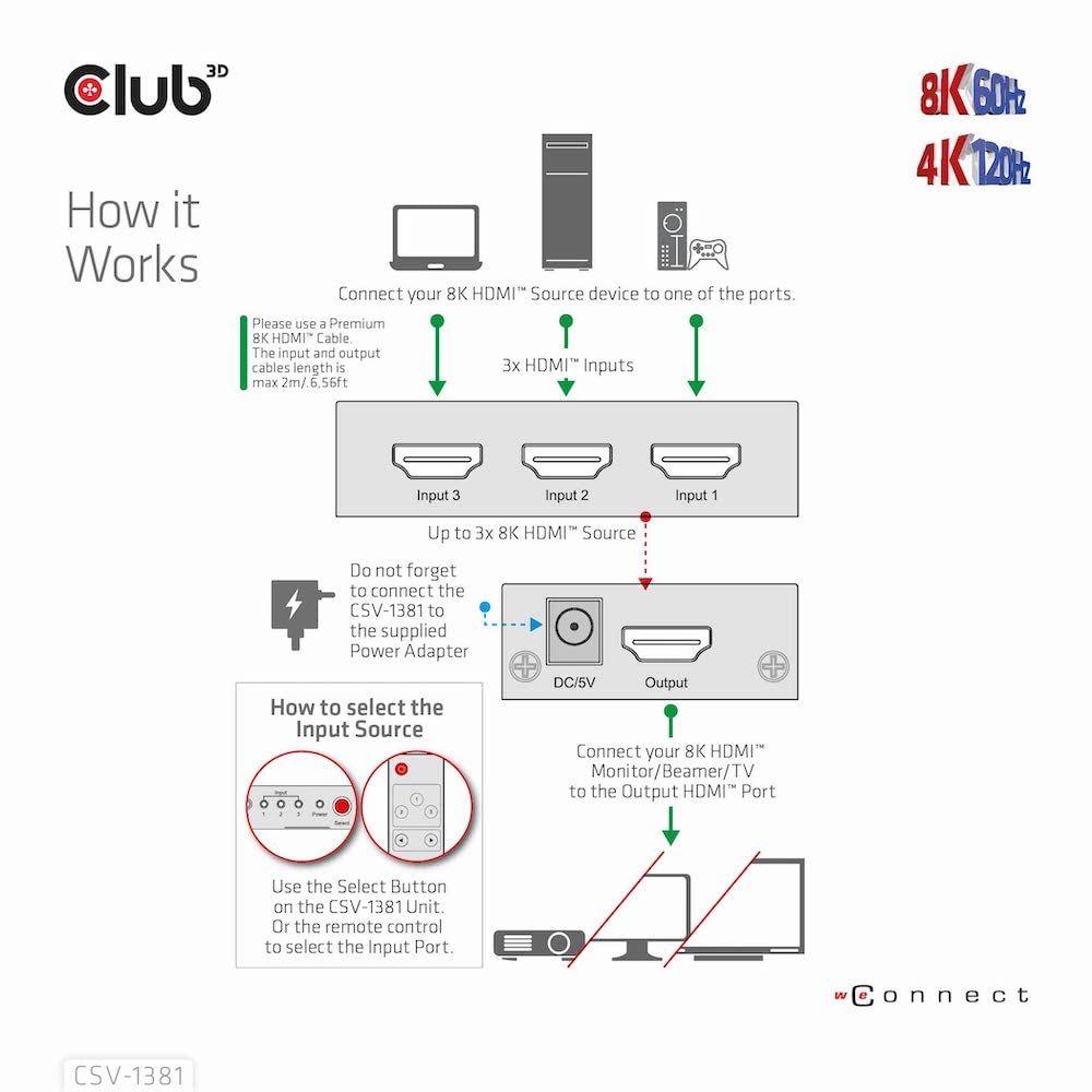 Club 3 D HDMI 8 K 60 Hz 4 120 3入力1出力 切替器 スイッチボックス Switch Box リモコン付き CSV 1381