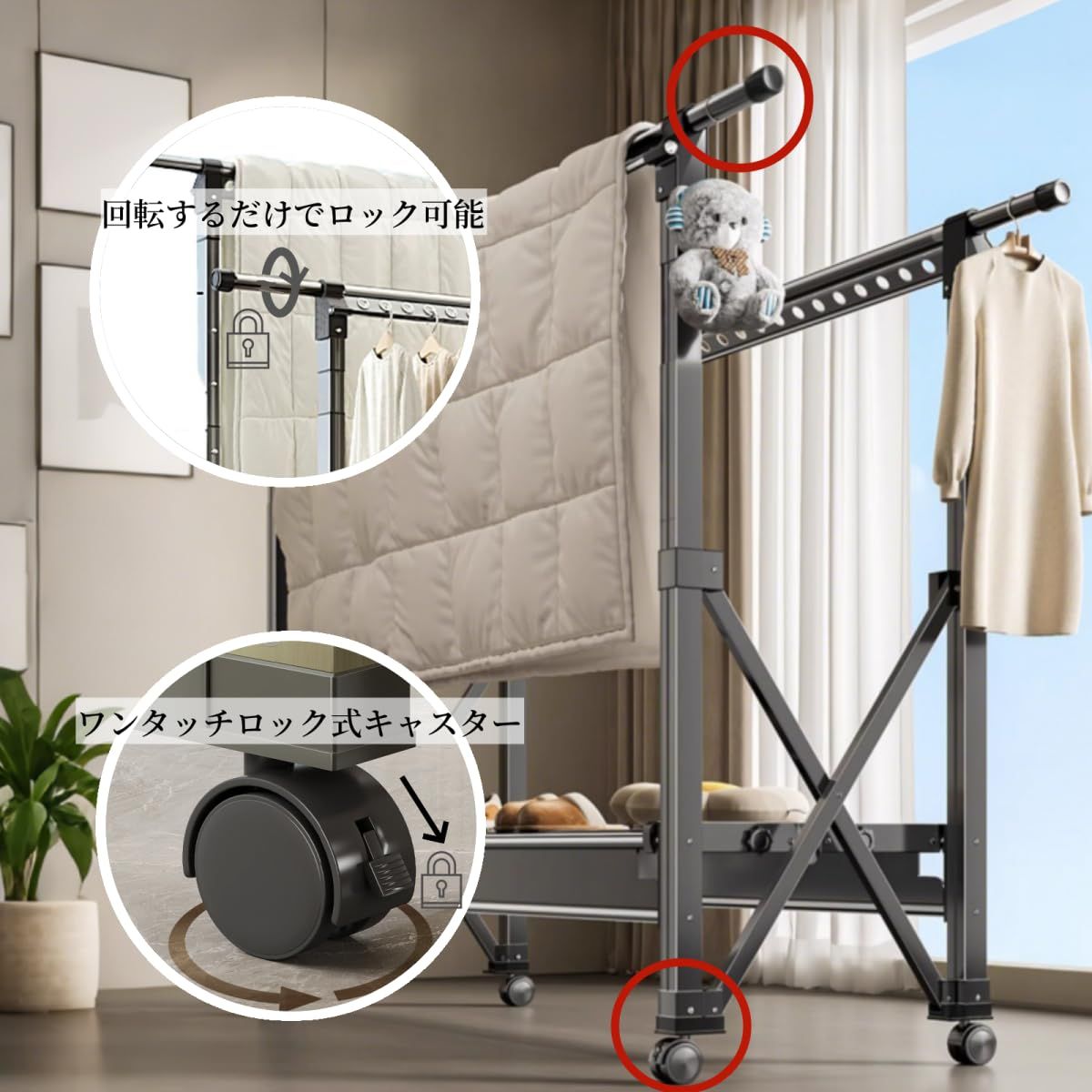 【頑丈なアルミ合金製】アルミ合金製で、高品質な素材を使用しているため、非常に耐久性に優れています。冬物の重いコートや羽毛布団でもしっかり支える設計です。