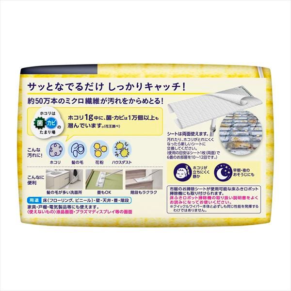 クイックルワイパーに取り付けて、フローリング・畳・ビニール床を立ったままラクにおそうじできるシートです。約50万本のミクロ繊維の立体構造シートで、髪の毛、ホコリはもちろん、静電気等ではりついた掃除機ではとりきれないミクロ汚れまでからめとって離しません。長い髪の毛もしっかりからめとります。花粉や微細なハウスダストまでキャッチします。シートは両面使えて、6畳のお部屋を約10~12回おそうじできます。