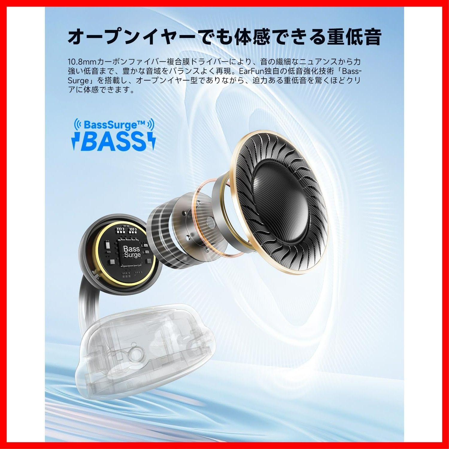 【EarFunがカスタマイズしたカーボンファイバー振動板&ハイレゾ認定& LDAC対応】高級オーディオ機器やプロ用録音機器にも採用されている、カーボンファイバー振動板を搭載した高性能ドライバーを初採用。これにより音の歪みを抑え、繊細な表現力と力強い低音を両立し、原音に忠実な再現を実現します。独自技術「BassSurge」によりオープンイヤーながら驚異的な低音表現を可能にしました。また、LDAC対応でハイレゾ音源(96kHz/24bit)を忠実再生。プロも認める高音質を、いつどこでもお楽しみいただけます。※「迫力ある重低音EQ」は現在、アプリのバージョンアップデートにより、EarFunのイコライザー画面から設定できるようになっています。