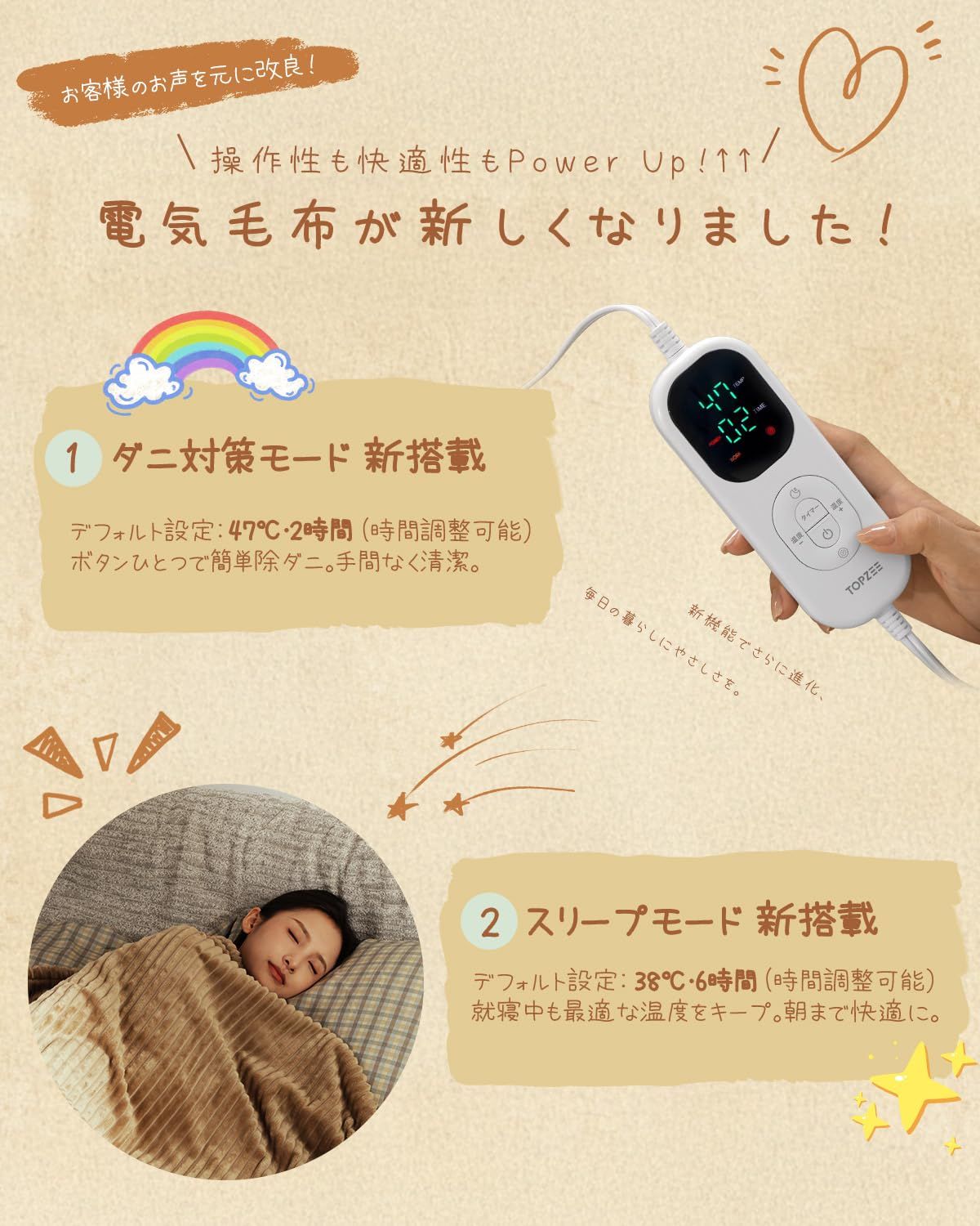 「シリーズ累計販売数10万枚突破の電気毛布が進化!TOPZEE電気かけしき毛布新登場」新作の電気掛敷毛布は、生地の厚みが従来品の1.2倍、暖かさが2.3℃プラス。ずっと触れていたくなる極上の肌触りの秘密は、寝具メーカーとしてこだわり抜いた高密度生地と長い毛足にあります。一般的な毛布の毛足は1.5cmですが、ふわもこ毛布はその2倍の3cmの長さにしたことで、高密度の極細繊維が肌を包み込みふわふわでとろける触感を実現。さらに新機能も充実:? 『睡眠モード』設定:38℃で6時間、睡眠中はあたためすぎないここちよい温度に。?清潔に保つ『ダニ退治機能』つき:47℃で2時間、布団に挟んで「強」設定で約2時間通電することで、高温に保ってダニ退治ができます。今年の冬も手放せない、進化した「掛敷兼用毛布」が完成しました。