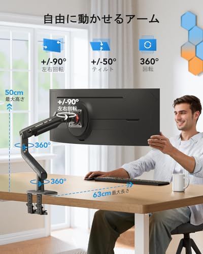 【広い可動域のロングアーム】より広い可動域で、ディスプレイをあらゆるの位置に設定可能です。自分に合った高さや角度にモニターの位置を変えられます。前後左右だけでなく、上下にも動かせる見やすい位置まで調節できるため、細かい文字や数字の確認や動画視聴、ゲーミングなどに適しています。