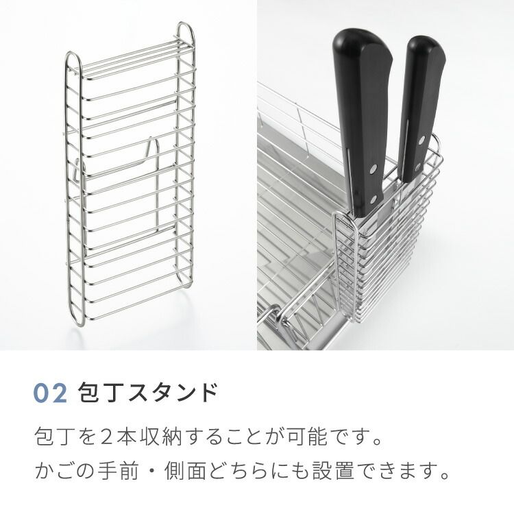 包丁スタンドは2本差し可能、かごの手前・側面どちらにも設置可能。