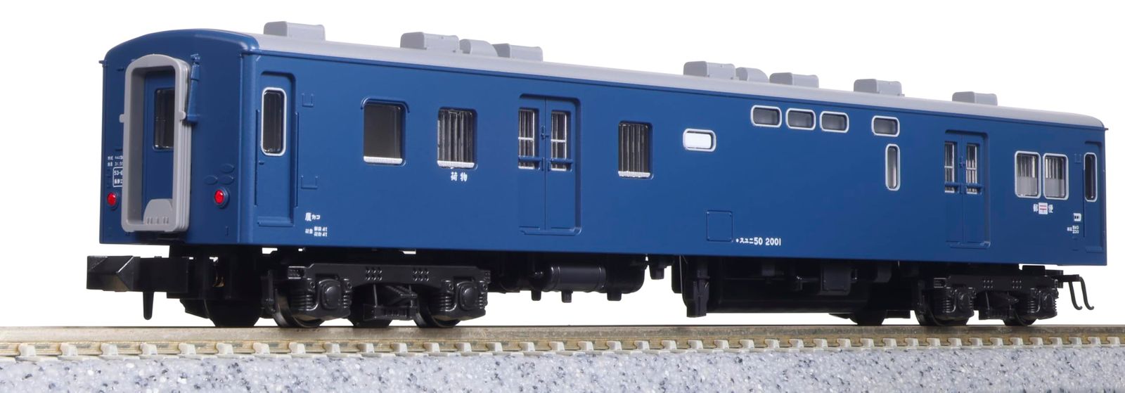 マニ50、スユニ50は、50系客車に準じた車体形状、大きな両開きの側面扉などを再現。